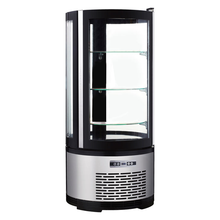 Con capacidad de 100 l. Base en acero inoxidable de forma circular con puerta abatible con auto cierre. Control de temperatura digital, rango de temperatura de 2 a 8°C y deshielo automático. 3 entrepaños de cristal circulares de altura ajustable de giro manual. Iluminación LED. Potencia de 230 W 110 V / 60 Hz. Peso neto 50 kg.